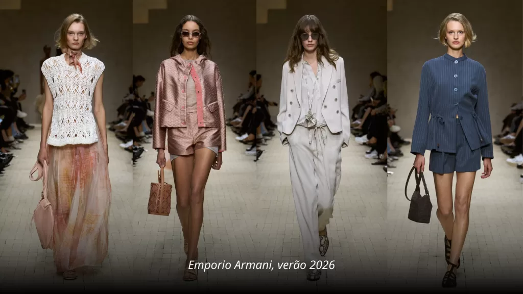 A Emporio Armani apresentou semelhanças com esse movimento, trazendo uma elegância silenciosa, apresentada no verão de 2026. A marca focou em neutros sofisticados, areia e cinza pálido, para uma alfaiataria relaxada. Os looks mostram a fluidez e os tons neutros da cartela “Equilíbrio”.