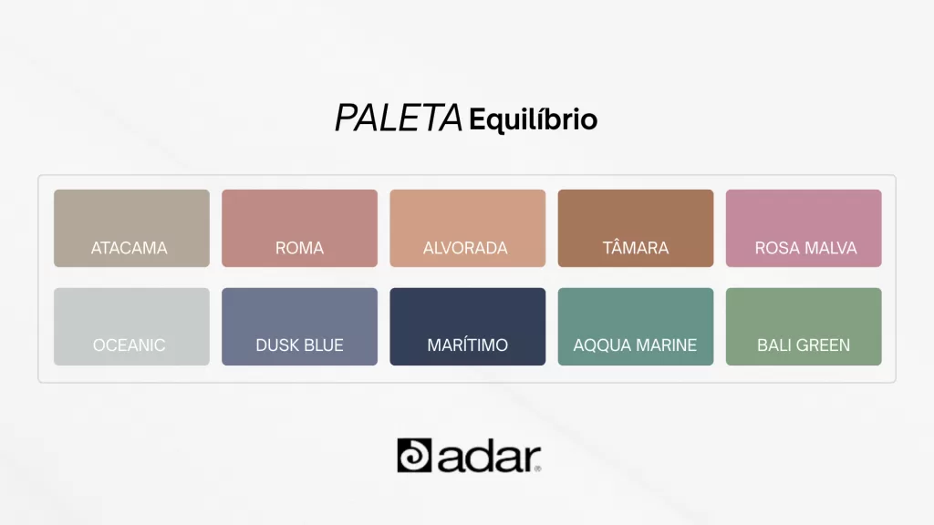 A cartela “Equilíbrio” revela estabilidade por meio de tons empoeirados e neutros. Cores como “Atacama” e “Alvorada” estabelecem uma base de areia e terra. Esta paleta é pensada para o trânsito entre o cotidiano urbano caótico e os momentos de pausa.