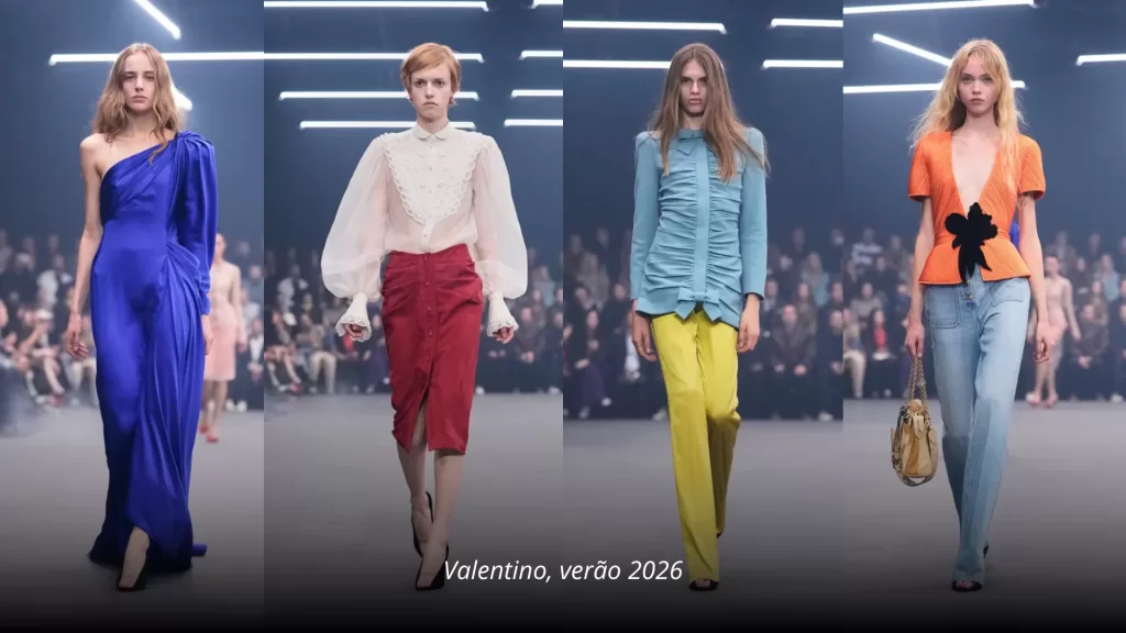 O uso de verdes lavados e azuis esmaecidos na paleta atua como ponto de respiro, reforçando a serenidade. A Balmain utilizou tons crus e tons de verdes mais refrescantes, alinhando-se aos terrosos e verdes da paleta “Equilíbrio”. O desfile Verão 2026 da marca é uma excelente referência desta cartela: confira essa coleção.