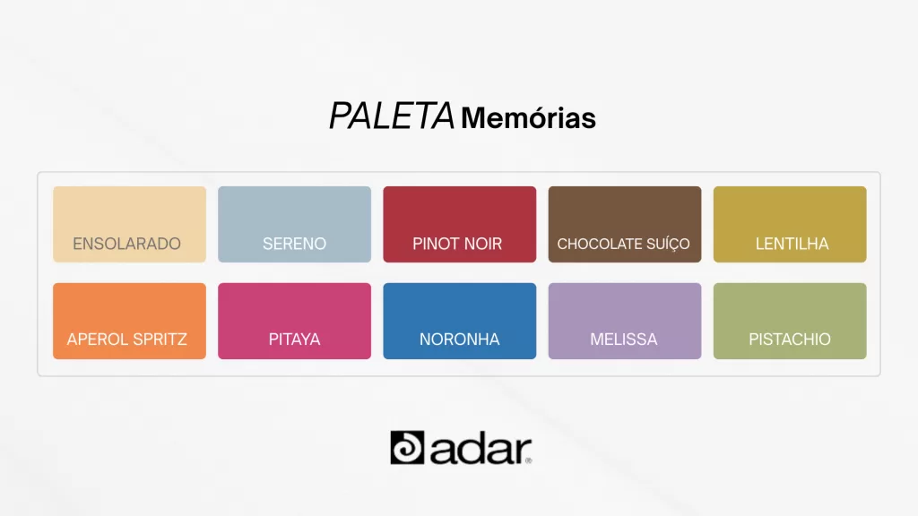 A paleta “Memórias” traz um contraponto lúdico, nostálgico e afetivo. Os tons ensolarados, azuis serenos e verdes pistache remetem à infância e aos dias despreocupados.