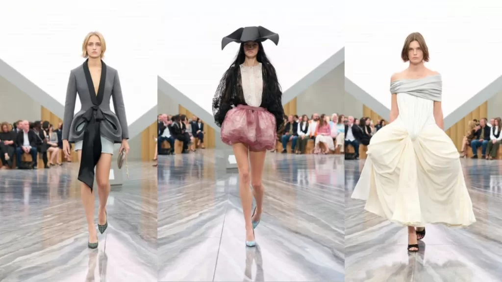 Entre os destaques, peças com forte aspecto escultural, com foco nas silhuetas que resgatam o volume nos quadris. Esta abordagem reinterpreta o pannier (estrutura usada para dar volume aos quadris no século XVIII).