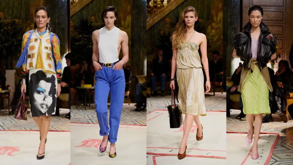 A primeira coleção de Vitale manteve-se fiel à identidade da Versace. O designer reeditou os toques maximalistas e ousados da grife, com uma notável reverência à estética dos anos 80.